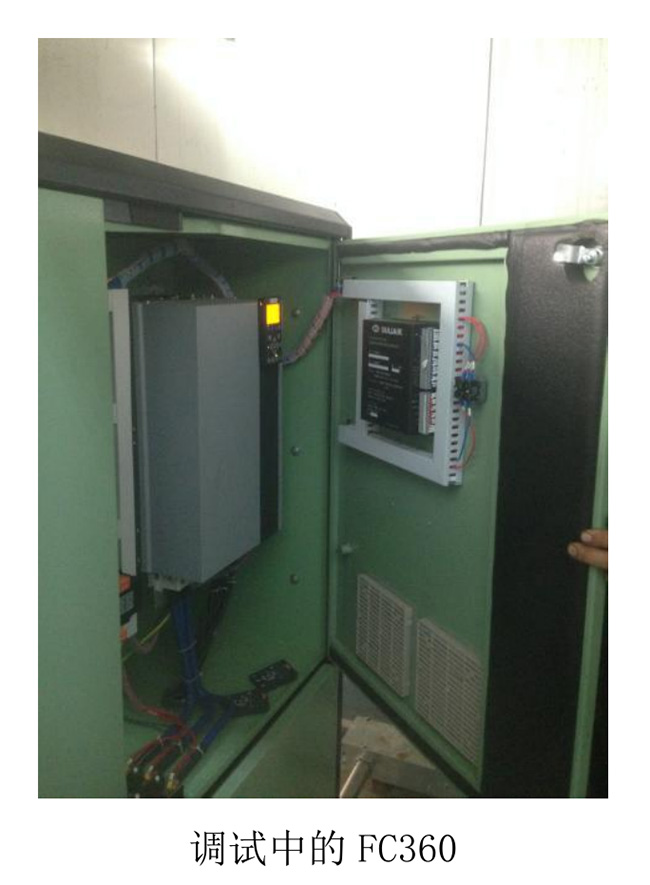 以上兩張圖片是我司在佛山某空壓機應用現(xiàn)場所拍,我司的技術工程師正在調試FC360變頻器??諌簷C變頻調速控制原理是電動機拖動空氣壓縮機旋轉,使之產生壓縮空氣,并存儲于儲氣罐中。儲氣罐中空氣壓力的大小取決于空氣壓縮機產生壓縮空氣的能力(本系統(tǒng)中即取決于電動機的轉速)和用戶用氣量之間的平衡狀況,為了保證供氣質量,要求儲氣罐空氣壓力穩(wěn)定在某一數值上。儲氣罐內的壓力為被控量,壓力變送器將儲氣罐的壓力變換成電信號送給變頻器PID單元,與壓力給定值進行比較,PID能單元根據比較所得偏差的大小和方向按預定的 PID 運算規(guī)律運算后產生控制信號改變變頻器的輸出,從而改變電動機的轉速,使儲氣罐內的實際壓力始終維持在給定值上。