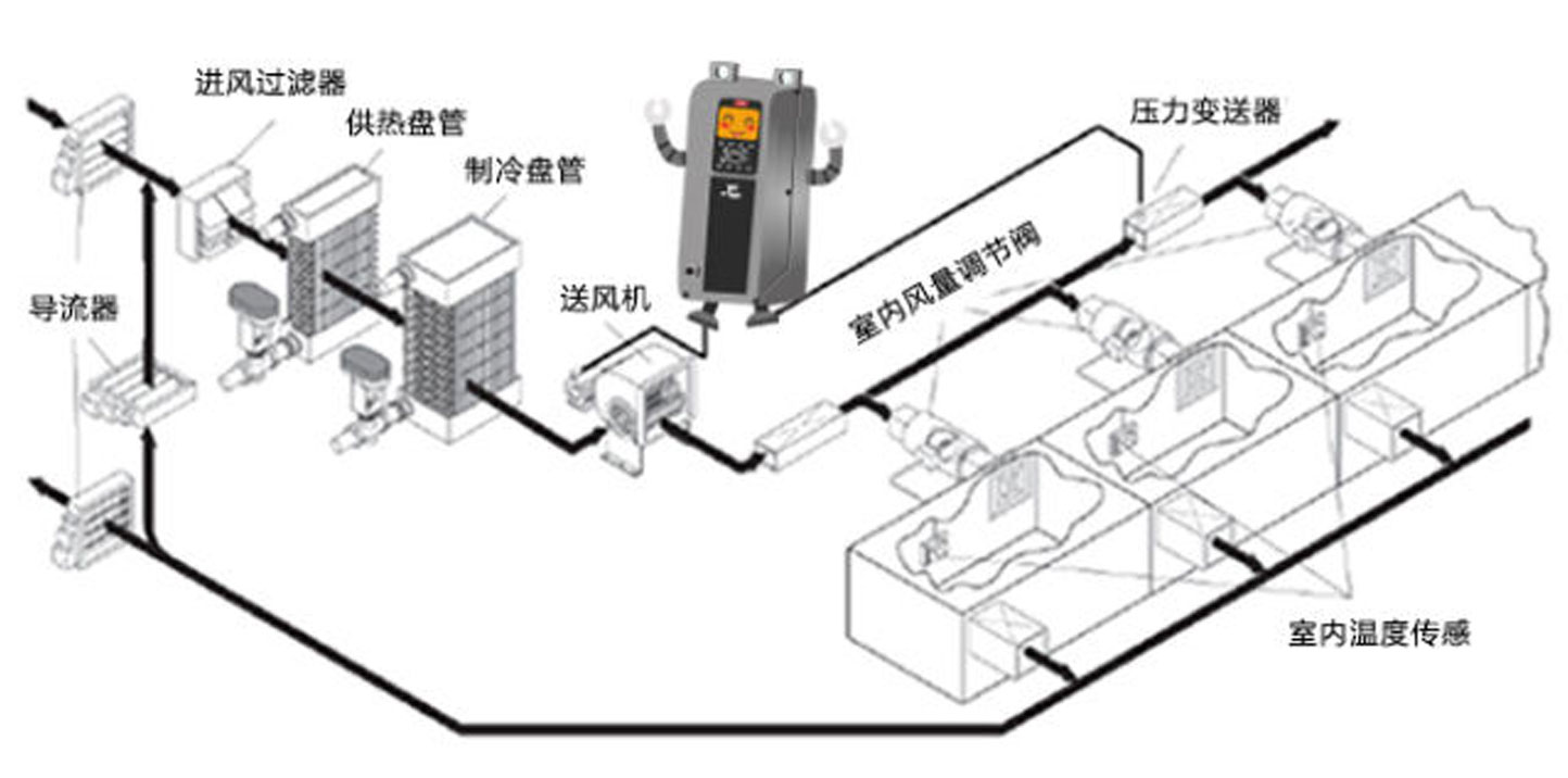 在假定送風主管道溫度恒定的前提下,當室內(nèi)溫度傳感器感測到溫度與控制器設定溫度不匹配時,控制器將改變室內(nèi)風量控制閥的開度,進而調(diào)整從送風主管道進入室內(nèi)的風量,改變室內(nèi)溫度。
