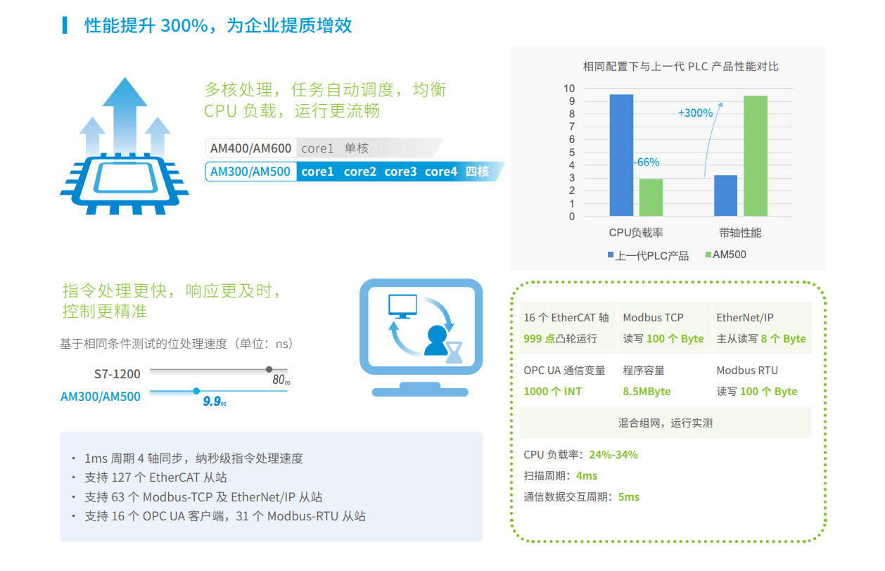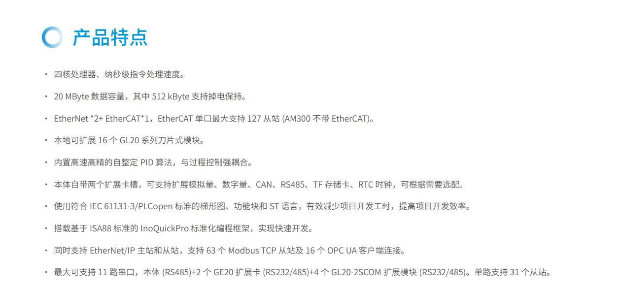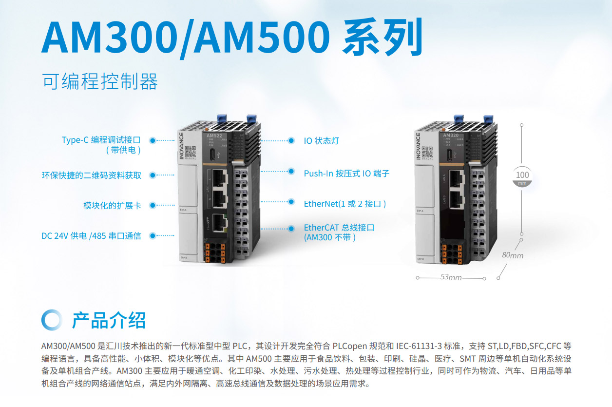 AM300系列是匯川技術推出的新一代中型PLC,其設計開發(fā)完全符合PLCopen規(guī)范和IEC-61131-3標準,支持ST,LD,SFC,CFC等編程語言,具備高性能、小體積、模塊化等優(yōu)點。集成如EtherNet/IP、OPC UA、Modbus TCP(支持兩路不同網(wǎng)段的IP地址)、TCP/IP、RS485(最大可擴展至3路)、CAN總線等全球標準工業(yè)網(wǎng)絡。主要應用于暖通空調、化工印染、水處理、污水處理、熱處理等過程控制行業(yè),同時可作為物流、汽車、日用品等單機組合產線的網(wǎng)絡通信站點,滿足內外網(wǎng)隔離、高速總線通信及數(shù)據(jù)處理的場景應用需求。其開發(fā)編程平臺InoProShop覆蓋從多軸復雜應用、離散單機應用到基本邏輯應用,可搭載匯川技術基于ISA88標準開發(fā)的InoQuickPro標準化編程模板框架,實現(xiàn)規(guī)范的標準化管理開發(fā),降低人才培訓成本。
