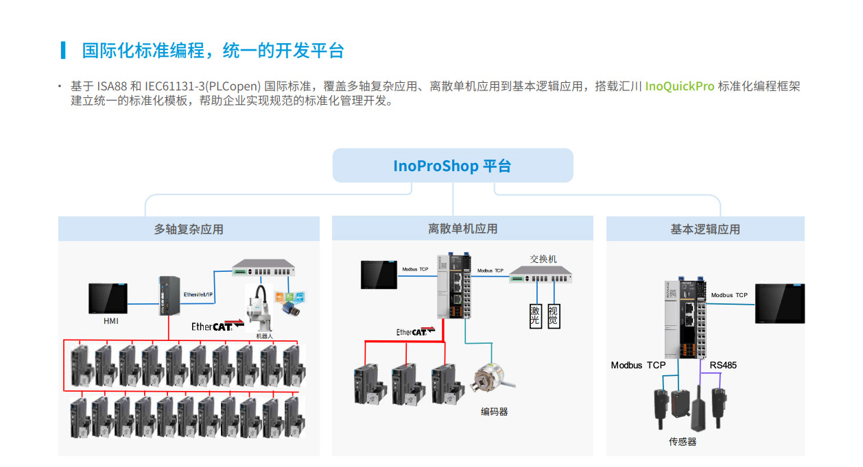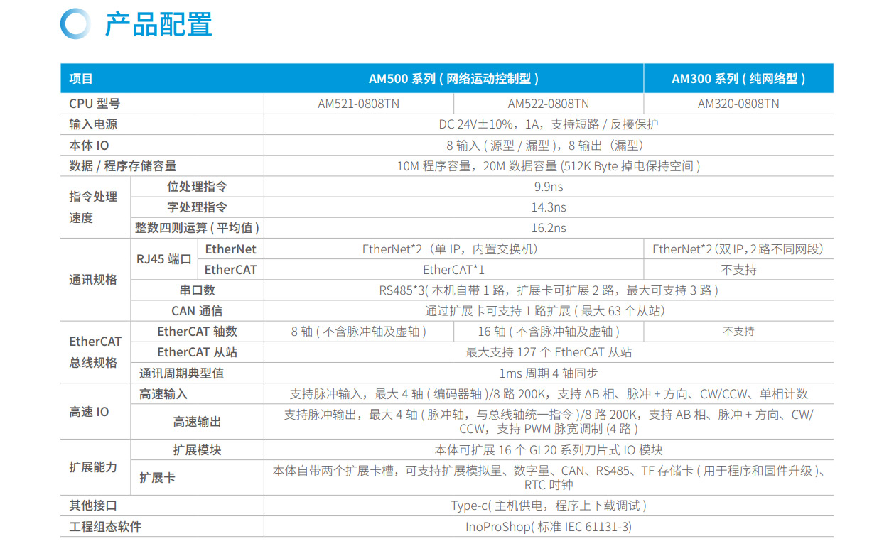 AM500系列是匯川技術推出的新一代標準型中型PLC,其設計開發(fā)完全符合PLCopen規(guī)范和IEC-61131-3標準,支持ST,LD,SFC,CFC等編程語言,以其小巧的CPU體積、模塊化靈活組合及高節(jié)拍生產特性可適應更多的應用場景。支持EtherCAT、EtherNet/IP、OPC UA、Modbus TCP(支持兩路同一網(wǎng)段的IP地址)、TCP/IP、RS485(最大可擴展至3路)、CAN總線等全球標準的工業(yè)網(wǎng)絡。主要應用于食品飲料、包裝、印刷、硅晶、醫(yī)療、SMT周邊等單機自動化設備及單機組合產線,滿足生產效率及控制精度提升場景需求。其開發(fā)編程平臺InoProShop覆蓋從多軸復雜應用、離散單機應用到基本邏輯應用,可搭載匯川技術基于ISA88標準開發(fā)的InoQuickPro標準化編程模板框架,實現(xiàn)規(guī)范的標準化管理開發(fā),降低人才培訓成本。