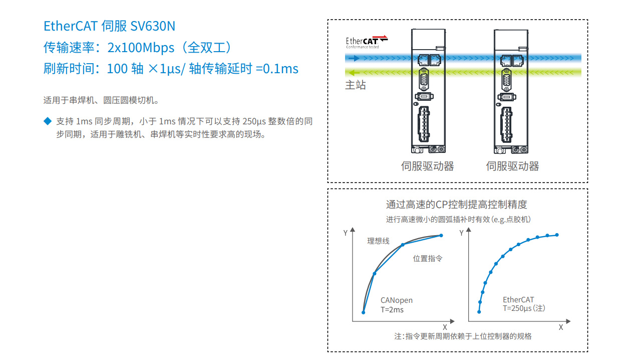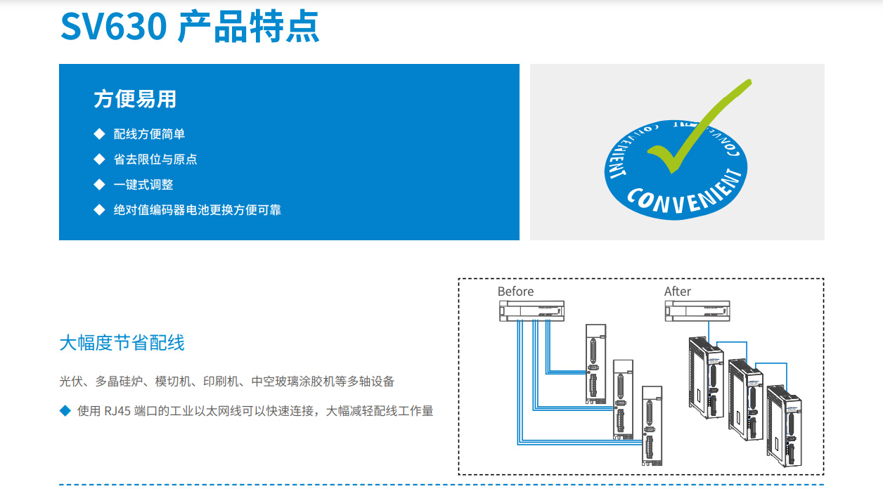 SV630 系列伺服是匯川技術(shù)研制的高性能中小功率的交流伺服產(chǎn)品。該系列產(chǎn)品功率范圍為0.05kW ~ 7.5 kW,采用以太網(wǎng)通訊接口,支持EtherCAT 、Modbus、CANopen 和CANLink 等通信協(xié)議,采用對應(yīng)的通信接口,配合上位機(jī)可實現(xiàn)多臺伺服驅(qū)動器聯(lián)網(wǎng)運(yùn)行。